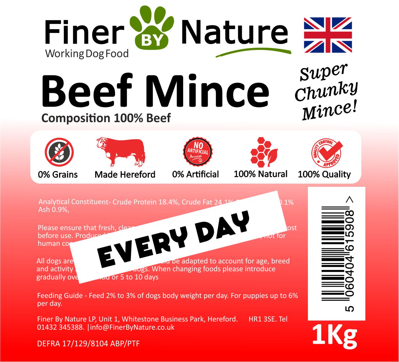 Made with 100% Beef and nothing else, our mince has a great texture that dogs love, super fresh made from frozen material not defrosted ensures our beef smells great, tastes great, looks great
