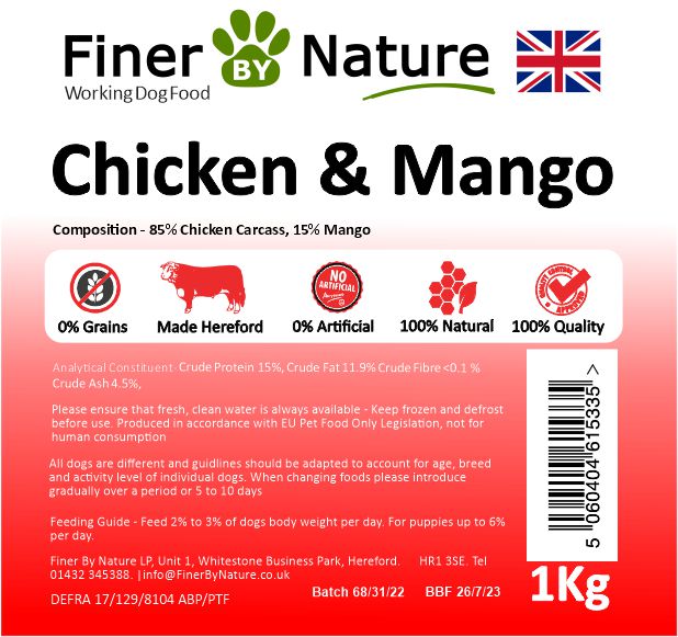 Made with 100% meaty Chicken carcass and fresh tasty mango and nothing else, our mince has a great texture that dogs love, super fresh made from frozen material not defrosted ensures our chicken & mango smells great, tastes great, looks great