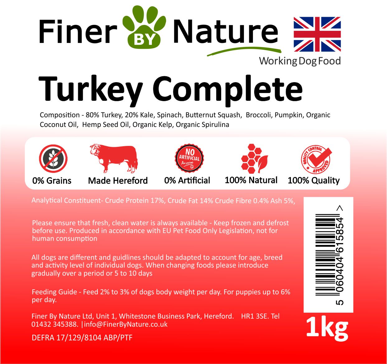 Made with 100% meaty Turkey Legs, chicken liver, 5 vegetables and 7 botanicals and nothing else, our Turkey complete has a great texture that dogs love, super fresh made from frozen material not defrosted ensures our turkey smells great, tastes great, looks great